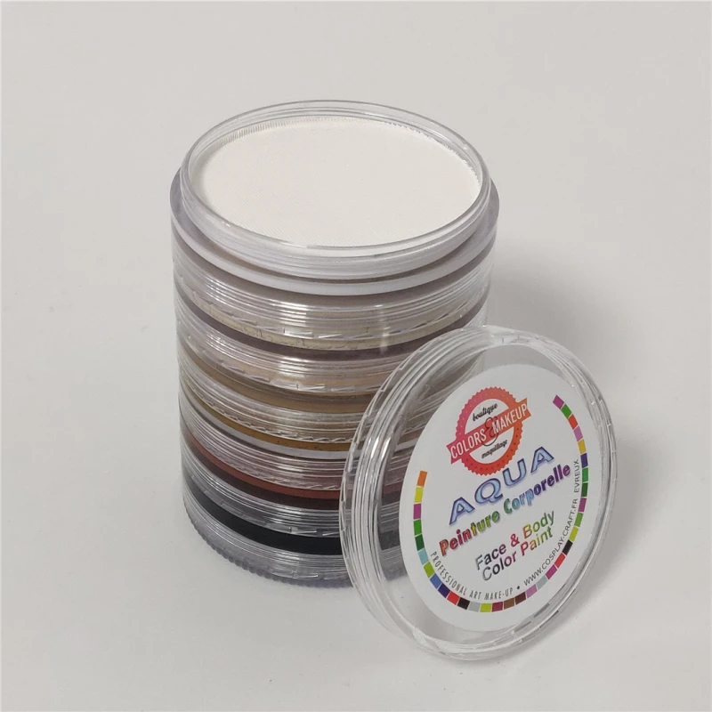 Ces fards humides offrent une couvrance parfaite. Les couleurs sont lumineuses, miscibles entre elles et superposables. Elles s’enlèvent facilement à l’eau claire sur les peaux bien hydratées. Les peaux sèches peuvent nécessiter l’emploi d’un peu de savon. Ces boîtiers s’empilent en se vissant les uns aux autres pour former une ou plusieurs tours pratique pour le transport et l’installation.