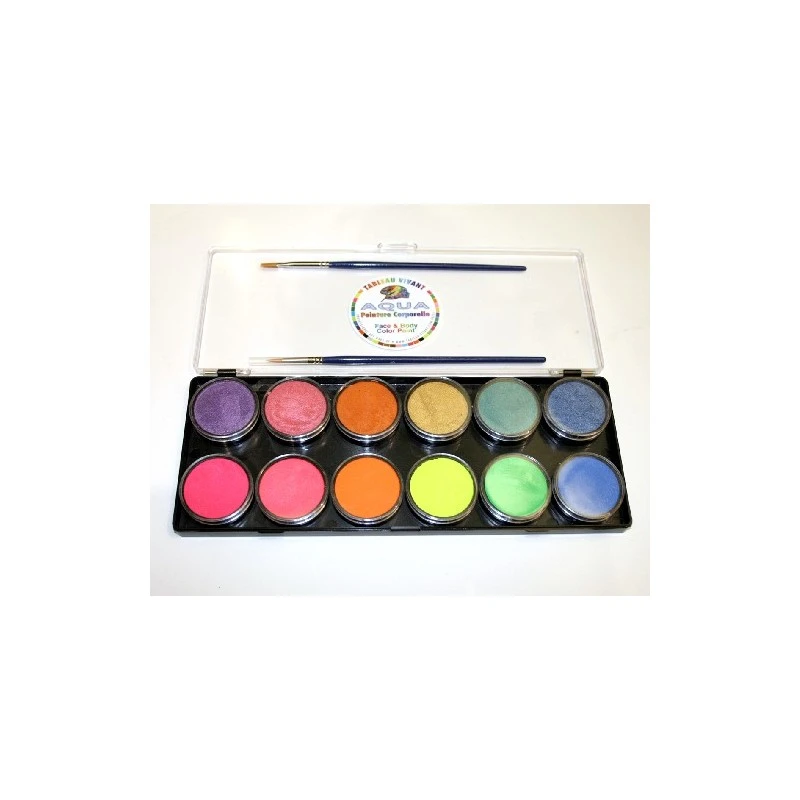 Cette palette comporte 12 tons spéciaux : 6 métaux (violet, rose, orange, or, vert et bleu) et 6 fluorescents (magenta, rose, orange, jaune, vert et bleu) et deux pinceaux synthétiques.